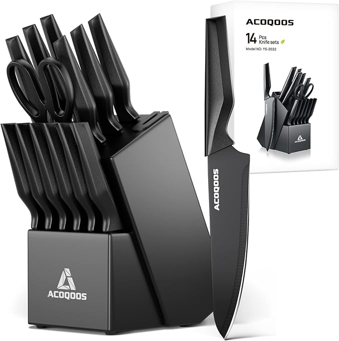 Knife Set with Block, 14 Piece with Built-in Sharpener, Kitchen Knives for Chopping, Slicing, Dicing Cutting by ACOQOOS