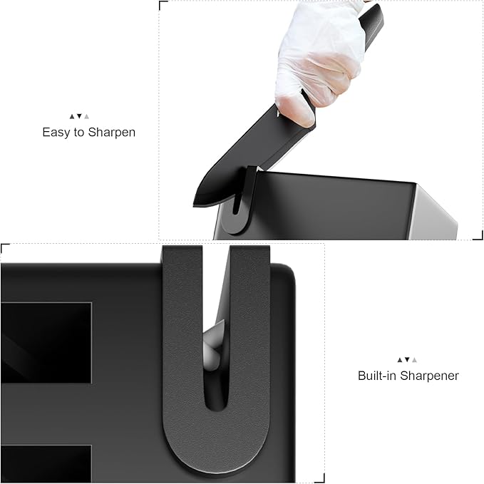 • Exclusive Built-in Sharpener: kitchen knife sets with built-in sharpener is a handy bonus. It saves you from having to honing blades on a sharpening steel