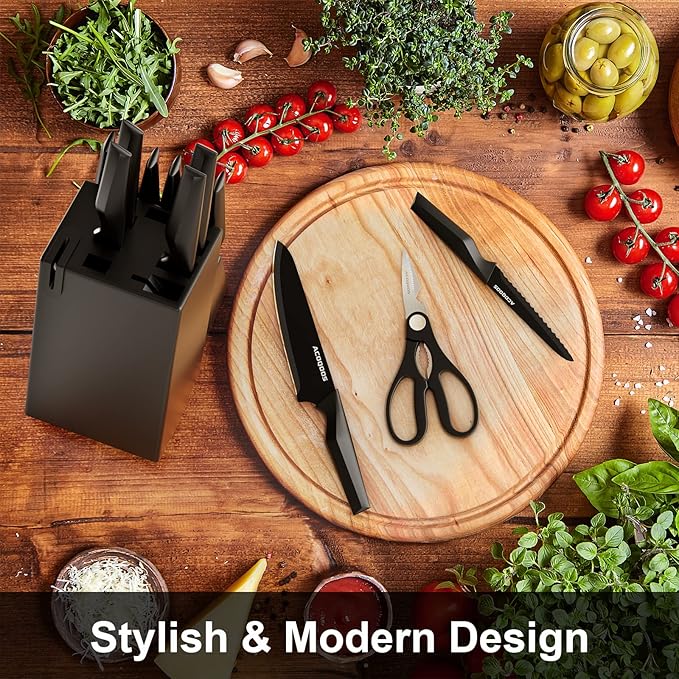 • What You Get: Essential knife set with block for both professional and amateur cooks. Perfect gift for wedding, birthday, housewarming, thanksgiving, halloween. Hassle-free 30 days trial and 12 months warranty.