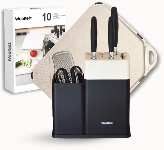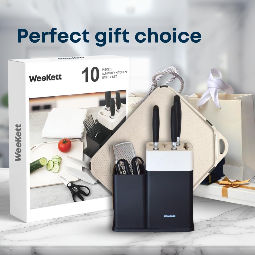 - Complete Kitchen Set: This 10-piece set includes everything you need for meal prep: a 20 cm chef’s knife, 20 cm slicing knife, 20 cm serrated bread knife, utility knife, paring knife, kitchen scissors, peeler, grater, chopping board with garlic masher, and a knife block with an integrated sharpener—perfect for any kitchen
