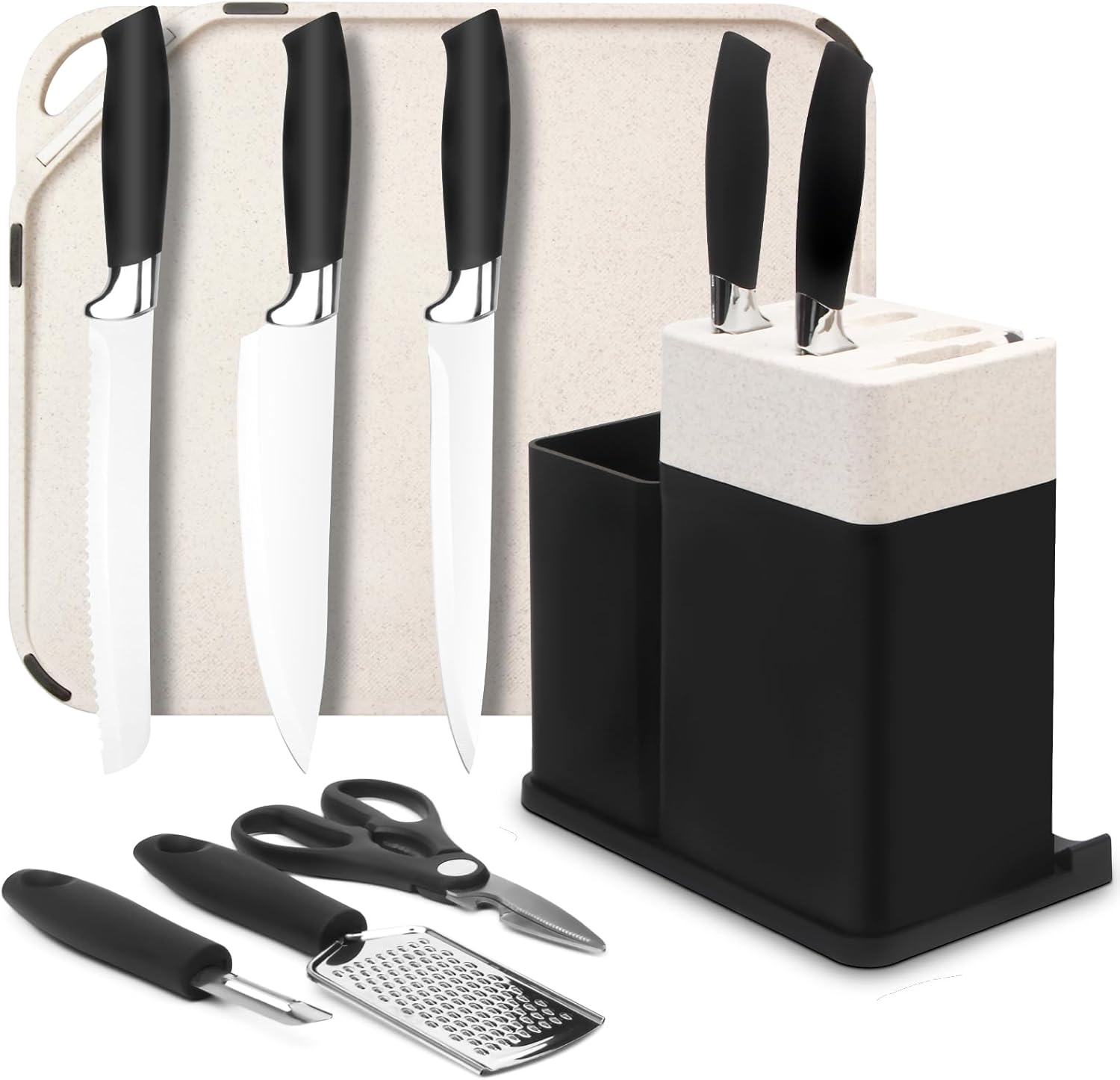 Knife Set with Block, 10 Pieces with Built-in Sharpener, Scissors, Peeler, Grater, Chopping Board – Dishwasher Safe, Rust-Resistant, Stainless Steel, Essential Cooking Tools