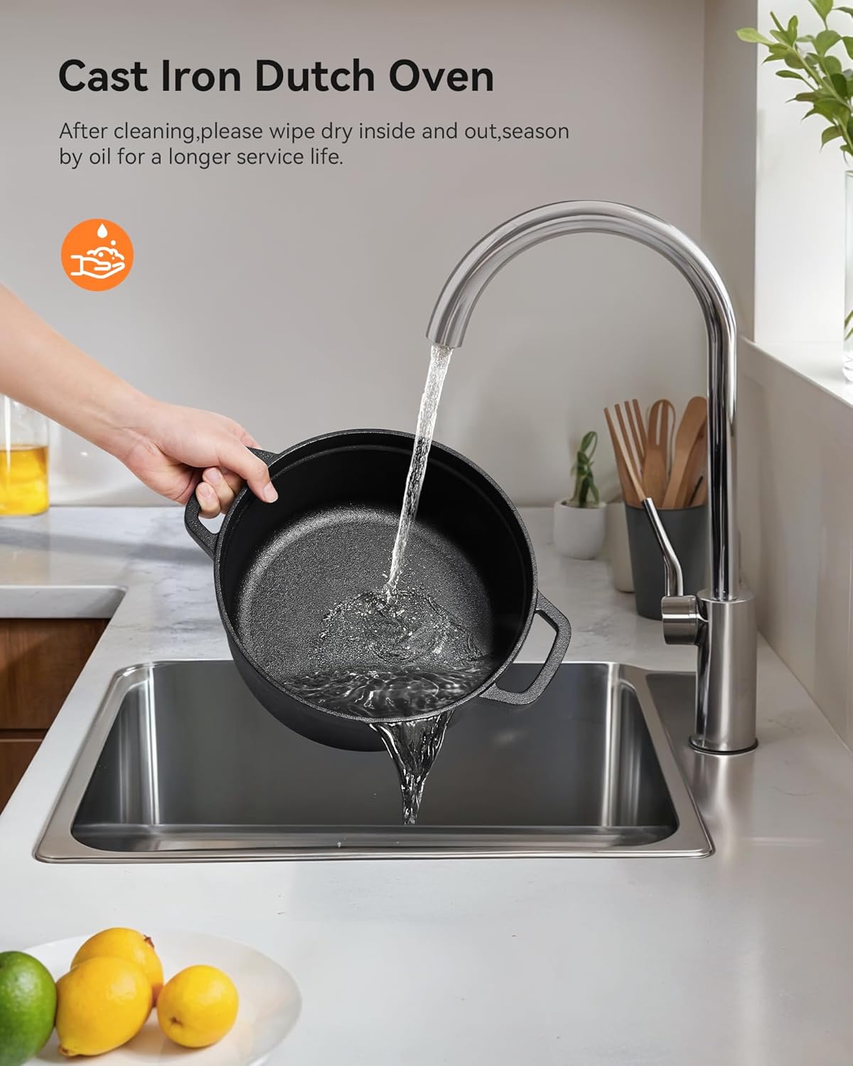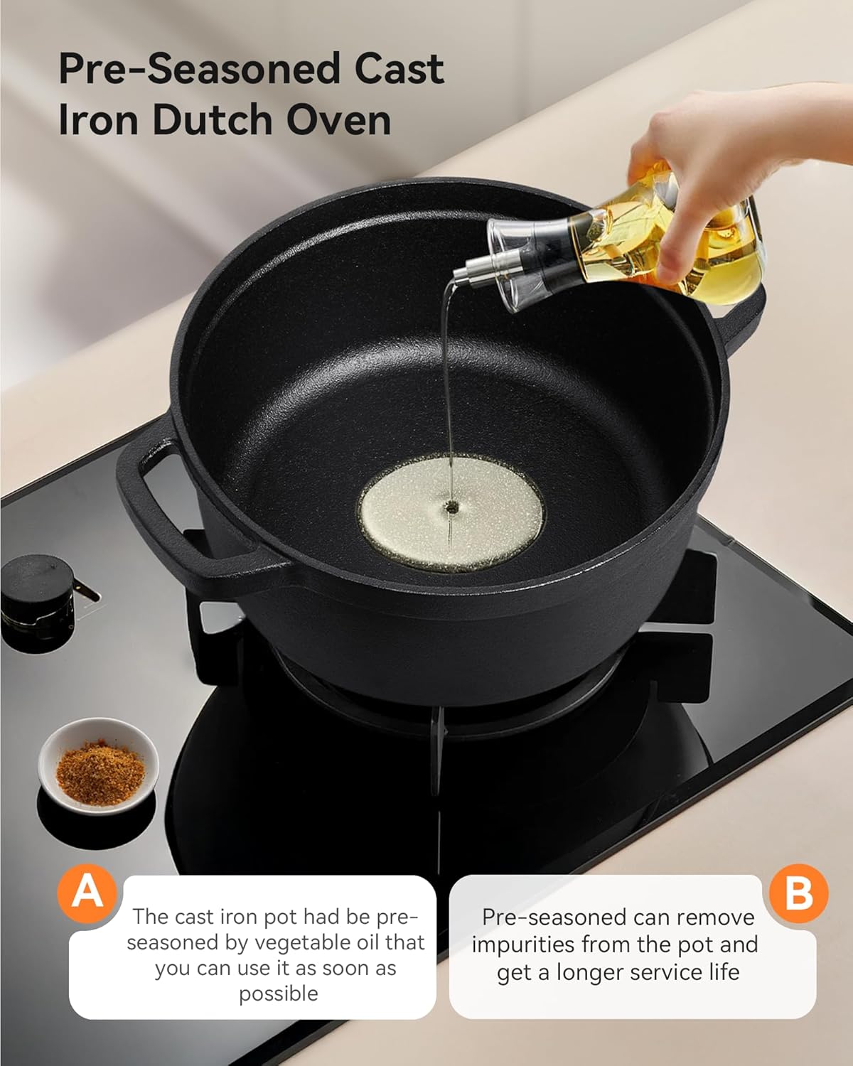 - 【Pre-seasoned】Pre-seasoned will make the cast iron pot more non-stick and durable.The cast iron dutch oven should be seasoned by cooking oil before first use for a long service life.